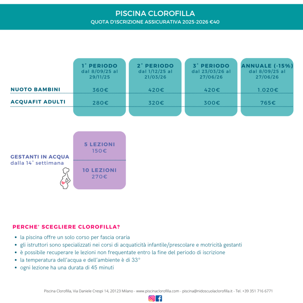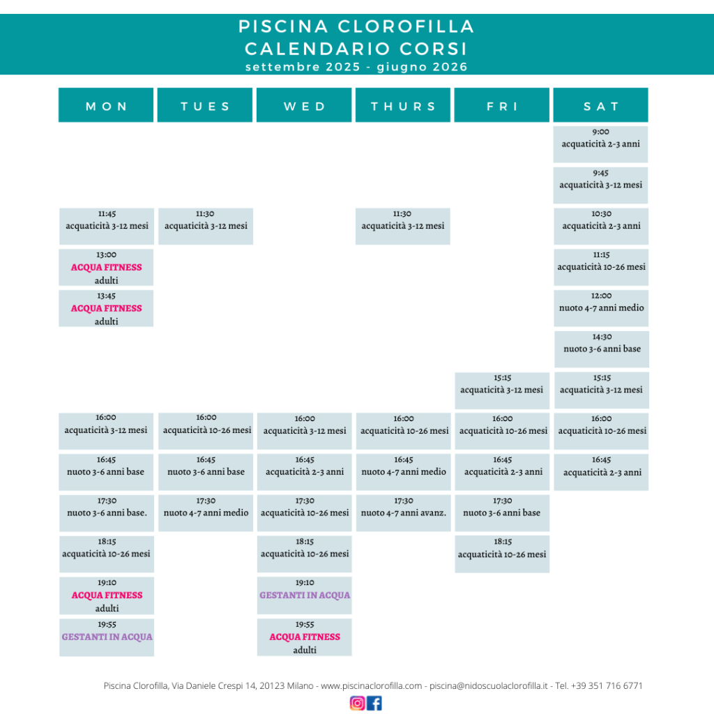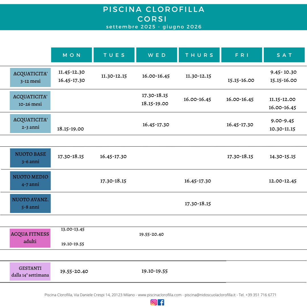 La Piscina Clorofilla propone corsi di acquaticità genitore-bambino, corsi di nuoto per bambini di differenti fasce d’età, dai 4 mesi agli 8 anni, e corsi rivolti agli adulti. Tutti i giorni, dal lunedì alla domenica, con frequenza monosettimanale.