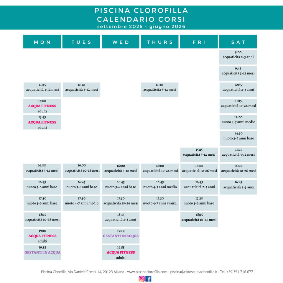 Ecco il calendario degli orari e dei corsi che si svolgono all’interno della Piscina Clorofilla